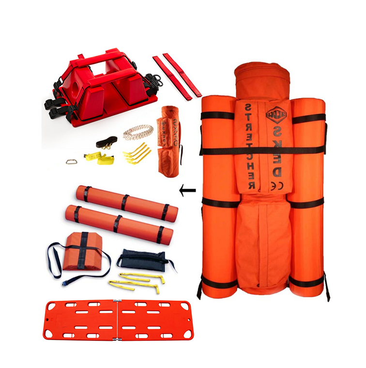 可漂浮救生擔架材質:柔韌塑料制成,強度高、耐磨性。可用于水面救援和山地救援;可加設固定扁帶,可防止拖拽造成損壞。高強度把手8個,工作負載:400kg,內置平板式可拆卸浮力輔助系統和脊柱板固定系統,方便固定傷員,配備:梅隴鎖1個(主軸拉力45kN、橫軸拉力8kN)、鋼制梨型鉤4個(主軸拉力36kN橫軸8kN)、垂直豎井提升繩1套、浮力輔助部件和脊柱板一套。擔架浮力:1.6kN。