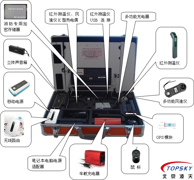 整套設(shè)備包括:筆記本電腦、紅外測溫儀、多功能風(fēng)速儀、GPS模塊、消防專用加密存儲器、立體聲音箱、無線路由器、電源系統(tǒng)、鼠標(biāo)、車載充電器、移動電源、筆記本電腦適配器、便攜箱、防水迷彩袋;