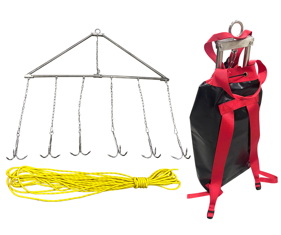 滾鉤整體為不銹鋼材質,鉤體采用三爪錨鉤,用于水下搜索溺水人員。整體三角可拆卸式,三角架經過靜載荷性能測試:承重220KG。材質:304不銹鋼材質;一套滾鉤24 枚, 鉤體:為三爪倒鉤形式,鉤體粗3mm、長度100mm,鉤與鉤間距15cm;主繩:長1500mm,直徑12mm。