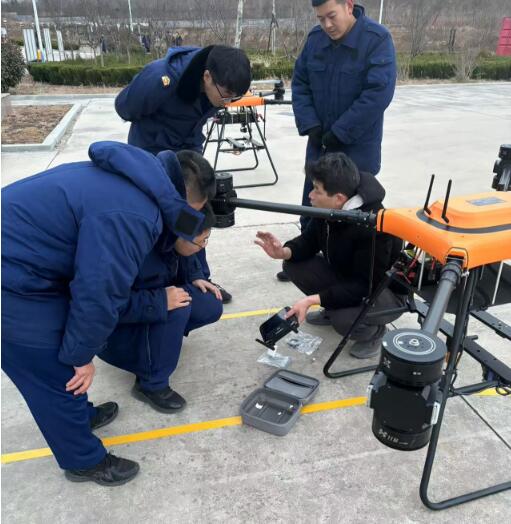 該無人機可裝載在消防車上,能快速啟動升空,通過特制高壓水帶與消防車水罐連接,消防車水罐內部高效泡沫/水基滅火劑輸送到無人機平臺,在水槍噴口水平噴射出去,達到滅火的效果。