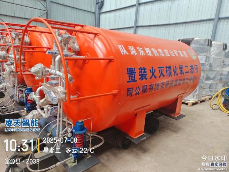 液態二氧化碳滅火裝置,采用平板車為運載平臺,搭載液態二氧化碳滅火模塊,采用液態二氧化碳為滅火劑,運輸至井下火區近附,經自增壓調控系統實現罐內穩壓,并通過遠距離輸送管路將液體從罐內向密閉火區噴射,利用其急速膨脹氣化和吸熱效率高的物理特性,可實現惰性降氧,吸熱降溫,吸附阻化等功能,從而可快速進行井下煤層自燃火災的預防與撲滅等。