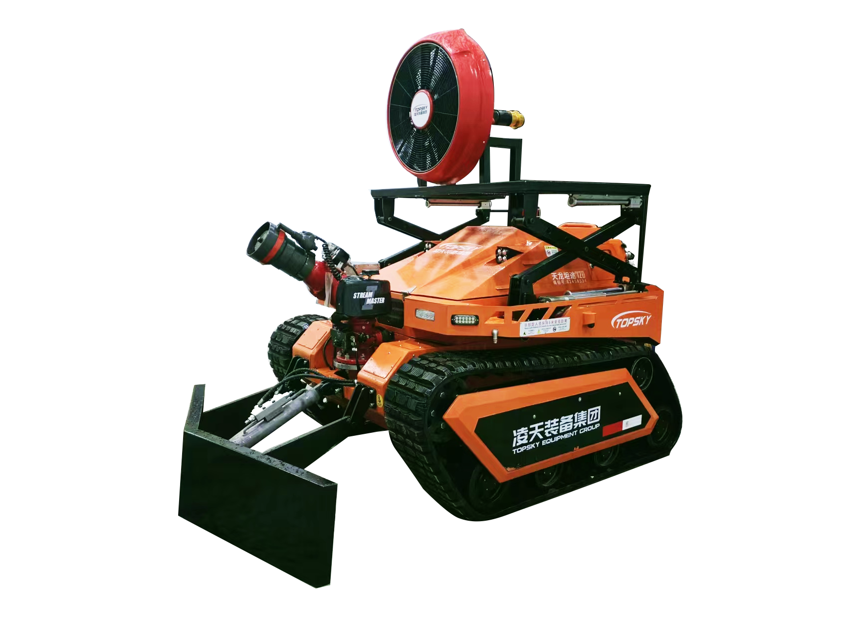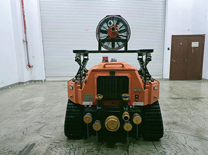 消防排煙滅火機器人是一款履帶式中型油動力消防滅火機器人,采用柴油發(fā)動機為動力,閉式液壓系統(tǒng)驅(qū)動ASV橡膠履帶進行高速行走,搭載了每秒120升的大流量消防炮,具有60000m3/h的可升降大流量水力排煙機,及V型推鏟,攜帶多種檢測、監(jiān)控傳感檢測裝置,對火災(zāi)場所實施遠程實時監(jiān)控,進行火災(zāi)撲滅、煙霧及有毒有害氣體驅(qū)散,道路開辟清障。