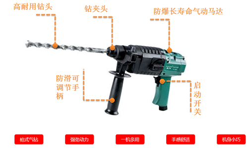 主要用于巖石,磚墻,混凝土等構(gòu)件上鑿孔,作安裝管道、架設(shè)動力線路、安裝地腳螺栓、化工廠、精煉廠、建筑、重工業(yè)、危險潮濕的隧道、水下及狹窄的空間作業(yè);尤其在高瓦斯防爆礦井中,氣動防爆無火花更能體現(xiàn)安全性。它是提高工效,減輕勞動強度的工具.