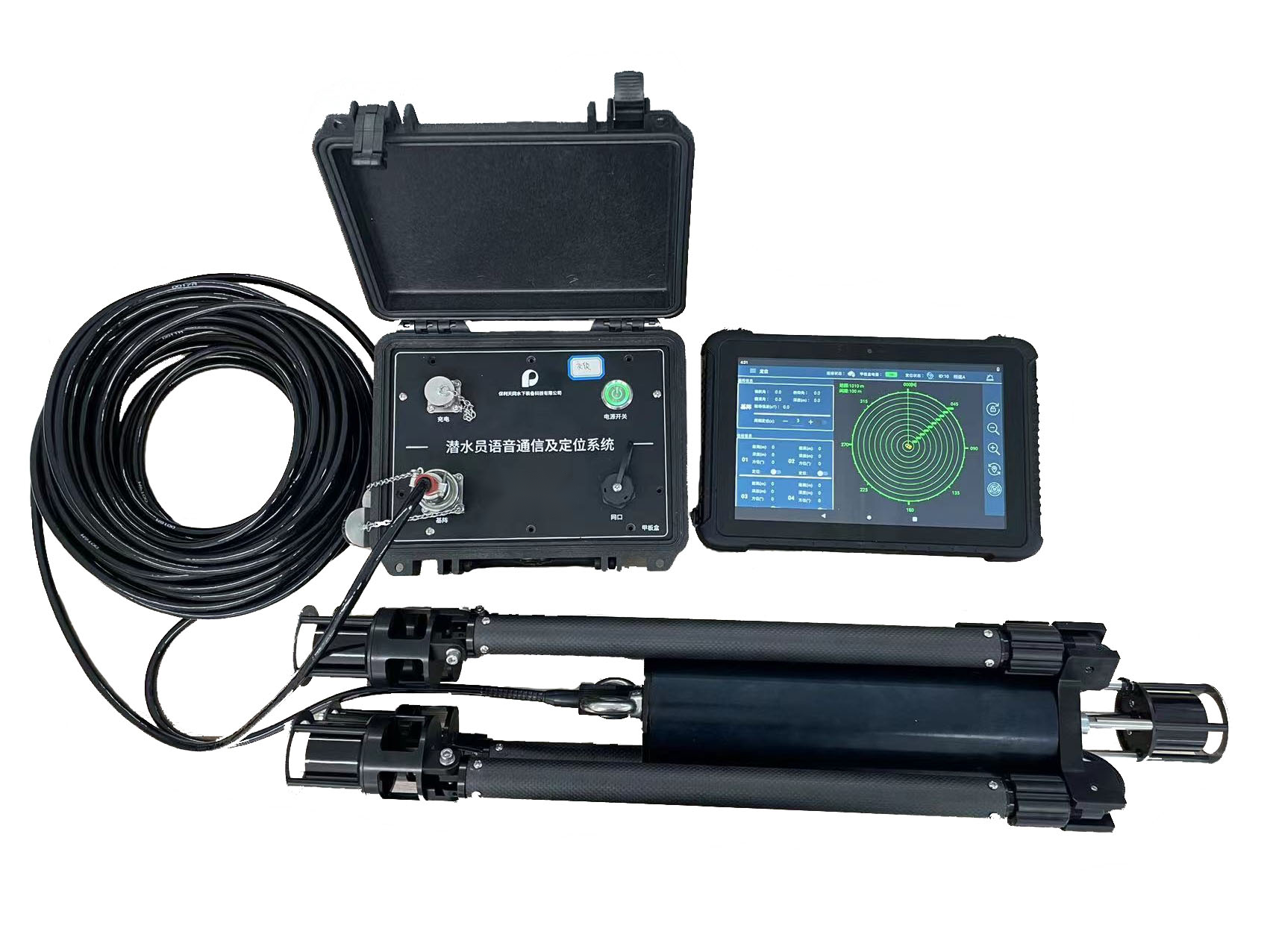 用于潛水員語音、數字通信及定位,具備水面指控系統、水面定位基陣、 水下潛水員單兵穿戴和顯示系統。通信距離1000-1500m,工作深度≥60m。