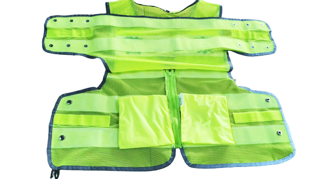 具有整潔美觀,平服的特點,線路規整,左右對稱,無開線、斷線、跳線、毛露、線頭、污漬、殘疵。產品基底顏色為熒光黃色;反光帶顏色為銀白色;縫紉線顏色應與縫合部位的基底材料或反光材料顏色相匹配;前后晶格標識可絲印定制文字