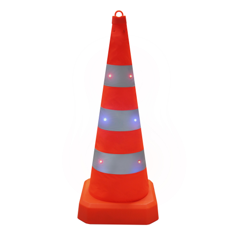 該發光路錐為LED發光伸縮路錐,高度通常為90cm,加頂燈高95cm,收納尺寸340340110mm,單重3kg。它采用300D防水防刮花牛津布材質,底座加大加寬,錐體重量集中在底部,穩定性好,不易被風吹倒。具備常亮、快閃、慢閃三種發光模式,可在不同場景下按需切換,夜間警示效果好。